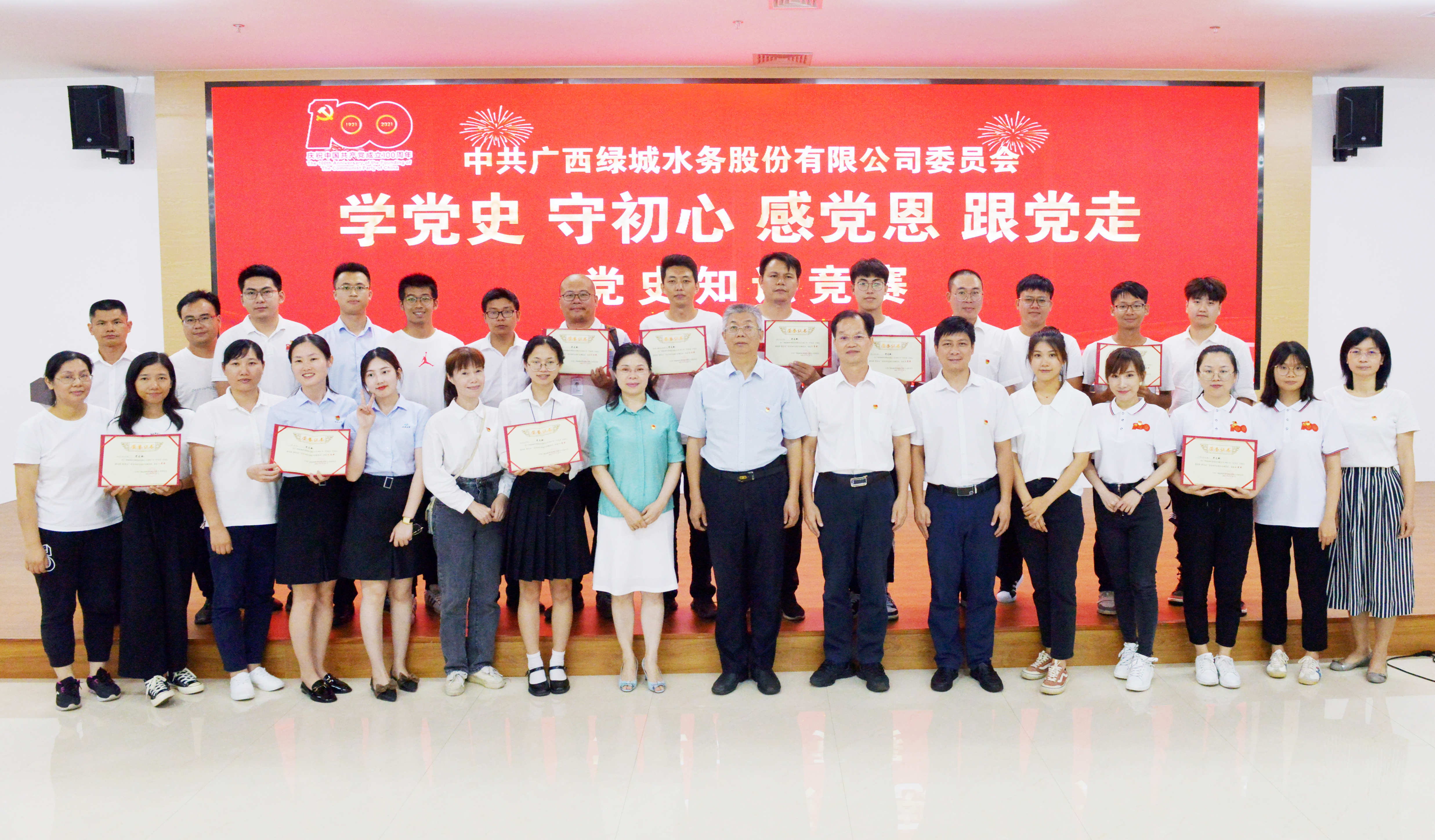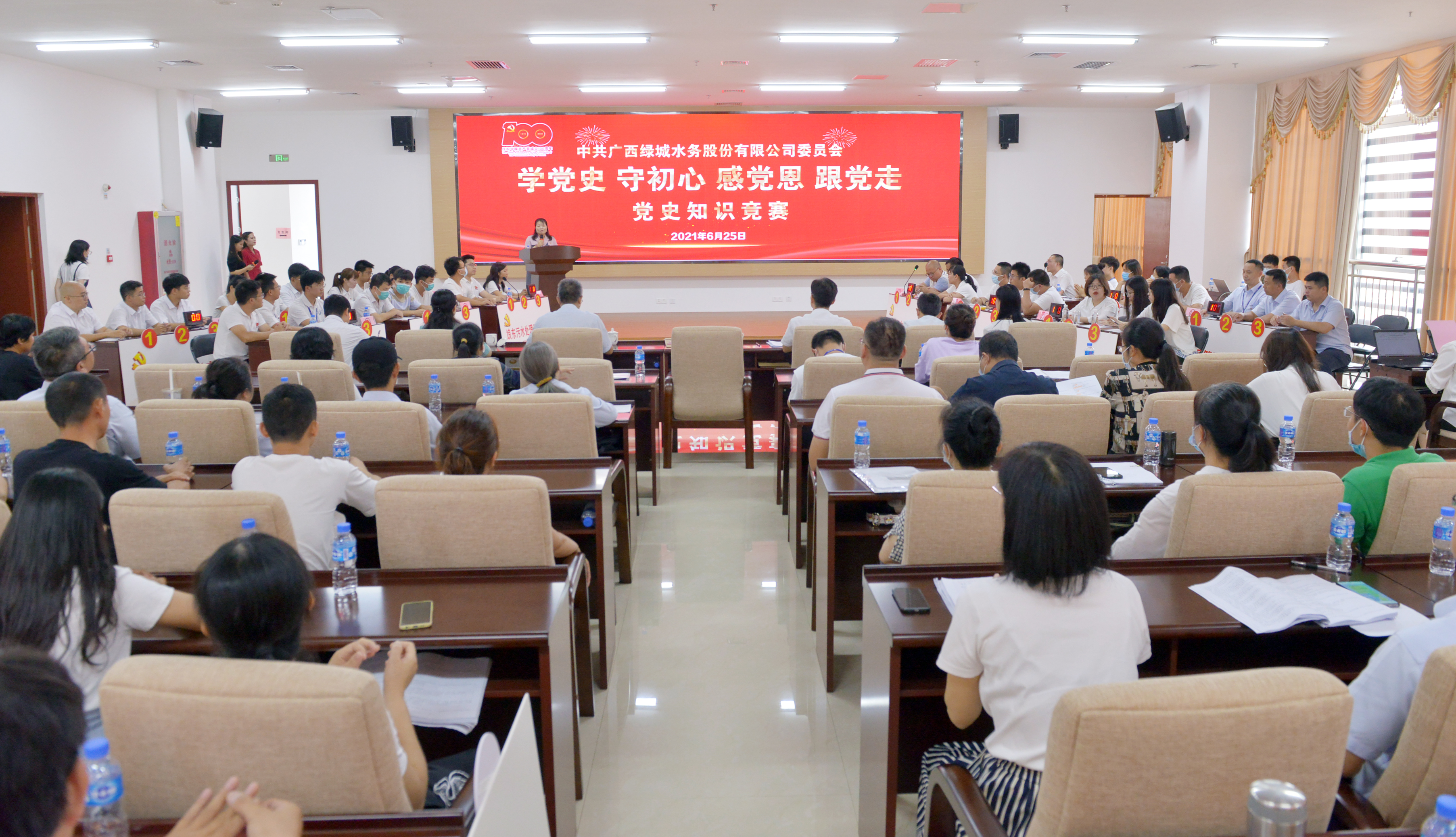 6月25日,廣西綠城水務(wù)股份有限公司黨委舉辦“學(xué)黨史 守初心 感黨恩 跟黨走”黨史知識競賽,以賽促學(xué),通過競賽帶動廣大黨員干部員工沉下心來學(xué)、聯(lián)系實(shí)際學(xué),推動黨史學(xué)習(xí)教育入腦入心。集團(tuán)公司黨委副書記、工會主席陳春麗出席活動并講話,股份公司黨委副書記、總經(jīng)理徐斌元,股份公司黨委副書記、監(jiān)事會主席嚴(yán)紅兵,股份公司紀(jì)委書記何華麗出席活動,集團(tuán)公司黨委辦公室副主任黃漢宜應(yīng)邀參加指導(dǎo)競賽活動。