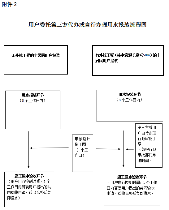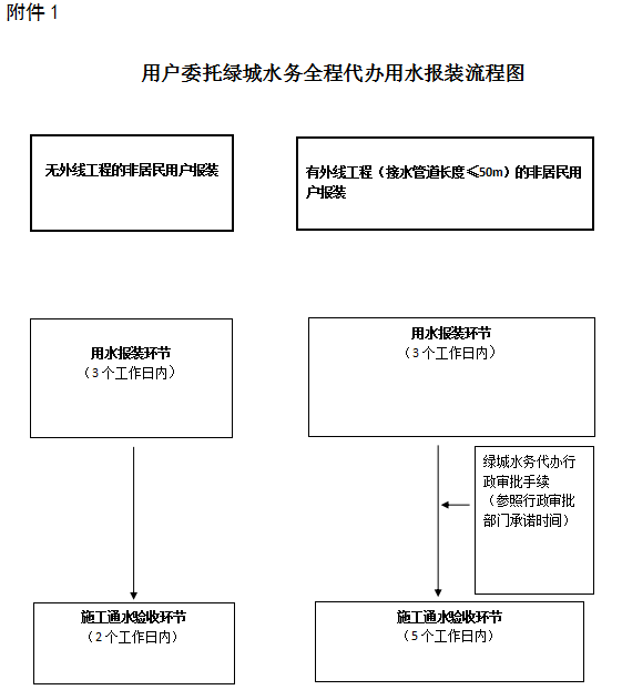 ①委托綠城水務全程代辦的,無外線工程施工通水驗收時間不超過2個工作日,有外線工程(外線工程長度≤50m)施工通水驗收時間不超過5個工作日,不包含辦理行政審批手續(xù)時間。