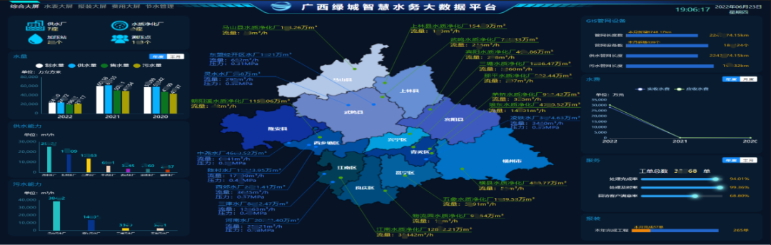 綠城水務(wù)大數(shù)據(jù)平臺(tái)于2019年9月啟動(dòng)建設(shè),于2020年12月建成,主要包括數(shù)據(jù)機(jī)房和平臺(tái)軟件建設(shè),投資約1100萬(wàn)元,該平臺(tái)于2021年6月取得了國(guó)家版權(quán)局頒發(fā)的計(jì)算機(jī)軟件著作權(quán)登記證書(shū)。綠城水務(wù)大數(shù)據(jù)平臺(tái)是綠城水務(wù)整個(gè)智慧水務(wù)項(xiàng)目的數(shù)據(jù)大腦,平臺(tái)按“一個(gè)中心、三大體系、五大板塊”的架構(gòu)設(shè)計(jì),整合了營(yíng)銷(xiāo)收費(fèi)系統(tǒng)、報(bào)裝系統(tǒng)、生產(chǎn)調(diào)度系統(tǒng)、地理信息系統(tǒng)、供水服務(wù)熱線系統(tǒng)的運(yùn)行數(shù)據(jù),通過(guò)可視化圖形直觀呈現(xiàn)平臺(tái)數(shù)據(jù),以更加“智慧”的方式輔助水務(wù)企業(yè)進(jìn)行管理和運(yùn)維,為業(yè)務(wù)開(kāi)展及管理決策提供了精準(zhǔn)、及時(shí)、有效的數(shù)據(jù)支撐,保證可靠供水,降低產(chǎn)銷(xiāo)差,提升運(yùn)營(yíng)管控能力,以數(shù)字化轉(zhuǎn)型賦能企業(yè)高質(zhì)量發(fā)展。