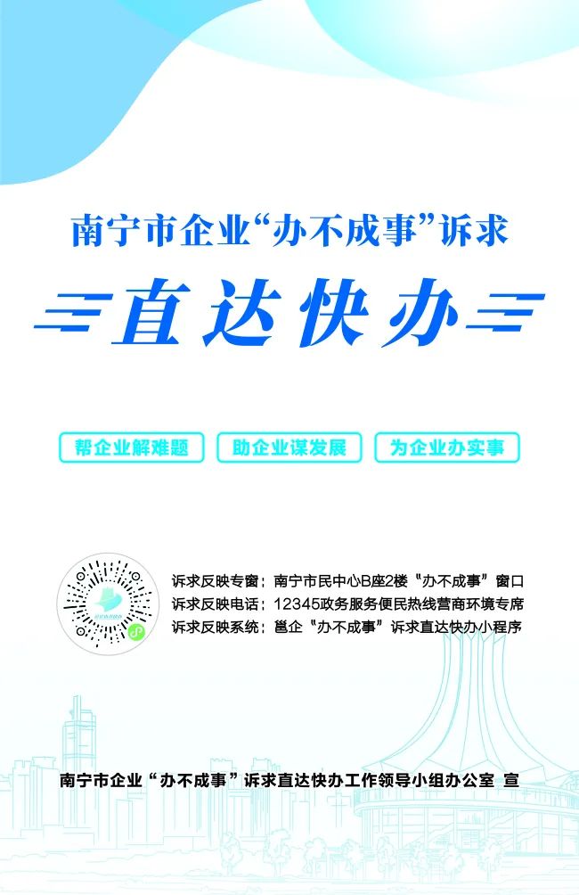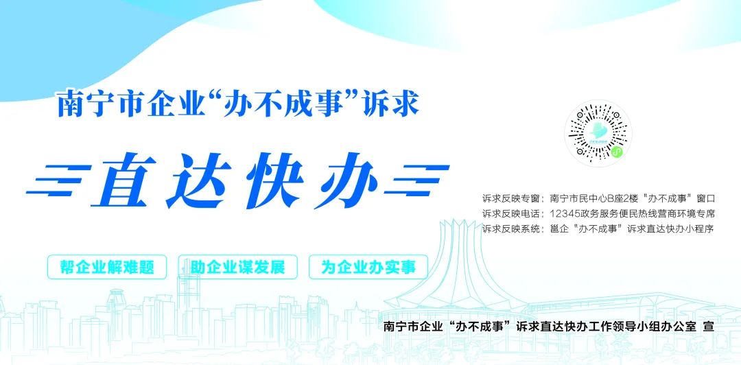 為貫徹落實中央、自治區(qū)經濟工作會議精神,優(yōu)化首府營商環(huán)境,南寧市建立企業(yè)“辦不成事”訴求直達快辦工作機制,依托南寧市民中心“辦不成事”訴求窗口、12345優(yōu)化營商環(huán)境專線、“邕企辦不成事訴求快辦”小程序收集企業(yè)訴求,暢通訴求反映渠道,整合紀檢監(jiān)察監(jiān)督、行政監(jiān)督、司法監(jiān)督力量推動責任落實,構建訴求受理、快速響應、高效辦理、答復反饋、跟蹤督辦、改進提升的全過程閉環(huán)管理體系,幫助企業(yè)破除“辦不成事”的難點、堵點、痛點、瘀點,及時解決企業(yè)經營發(fā)展難題、積極回應關心關切、幫助企業(yè)提振信心,切實為企業(yè)解難題、辦實事,為建設面向東盟開放合作的國際化大都市開好局起好步提供有力支撐。
