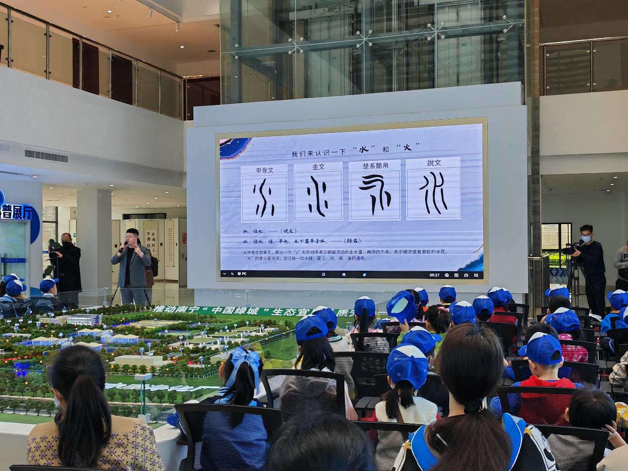 “‘水’這個字,從甲骨文到篆文,都以一個“s”形的線條表示蜿蜒流動的主水道。自古以來,水一直與人類生產(chǎn)生活息息相關(guān),水可以用來灌溉,還可以用來滅火……”上午9時(shí),在廣西廣播電視臺教育廣播主持人宇航生動有趣,貼近生活的講課中,活動拉開了序幕。