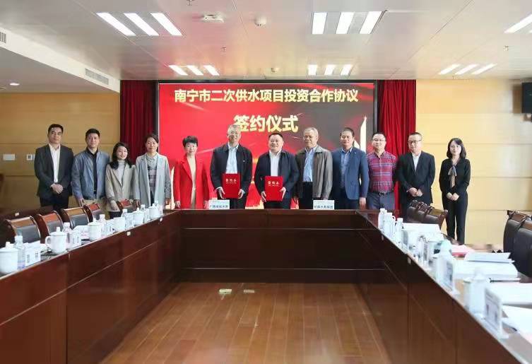 (圖為廣西綠城水務(wù)股份有限公司與廣西北投集團(tuán)直屬企業(yè)北投環(huán)保水務(wù)集團(tuán)舉行南寧市二次供水項(xiàng)目投資合作協(xié)議簽約暨廣西二次供水投資建設(shè)有限公司成立儀式)